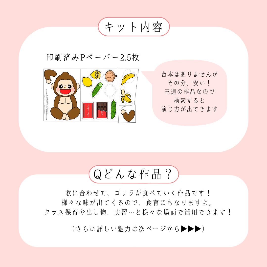 #保育教材 #パネルシアター #ペープサート #スケッチブックシアター #マグネットシアター #部分実習 #手袋シアター #製作 #壁面 #くいしんぼうごりら #くいしんぼうゴリラ #食いしん坊ゴリラ